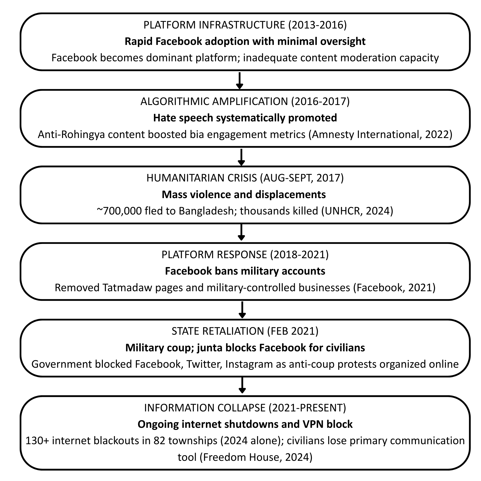 These dynamics are visible across domains. In 2017, false narratives and hate speech circulated on Facebook helped justify attacks against the Rohingya minority in Myanmar, showing how online misinformation can escalate into real-world atrocities (Amnesty International, 2022). In the years that followed, Myanmar authorities imposed internet shutdowns and social media restrictions, citing security concerns but in practice restricting freedom of expression (Human Rights Watch, 2019).